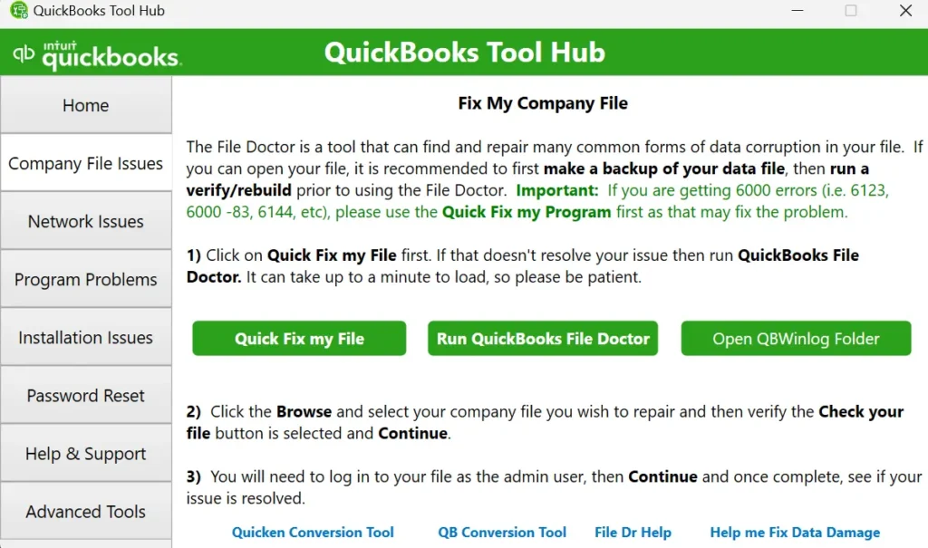 There could be a problem in the QB program itself. In such cases, you should run the Quick Fix My Program tool. To run this tool, you need the QuickBooks Tool Hub installed on your device. You should download it from the official Intuit site. After confirming QB Tool Hub is available, follow the steps below to use Quick Fix My Program.