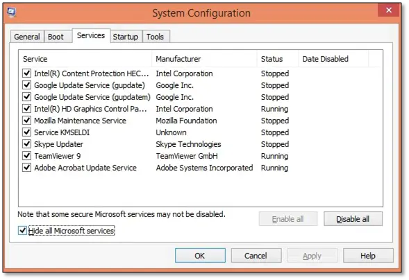 - Remove the check marks for Hide all Microsoft services