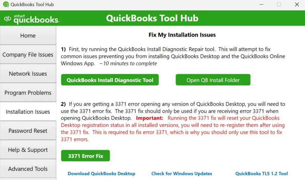 - Start by accessing the QB Tool Hub, and then click on Installation Issues
